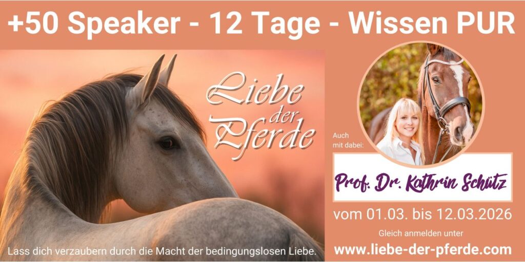 Beim Kongress „Liebe der Pferde“ bin ich neben mehr als 50 Speakern als Expertin für das Thema Gelassenheit und Entspannung statt Stress, Unsicherheit und Angst dabei. Vom 01.03. bis 14.03.2026 gibt es 14 intensive Tage voller Inspiration, Lösungen und Wissen pur. In dem Interview erkläre ich, wie Gelassenheit statt Stress in sämtlichen Bereichen rund ums Pferd, ganz besonders aber beim Reiten und auf Turnieren funktioniert. Setze dir Ziele, die du und dein Pferd auch erreichen können. Erkenne Herausforderungen und gehe sie an – nicht irgendwann, sondern jetzt. Nur so erreichst du deine Ziele.