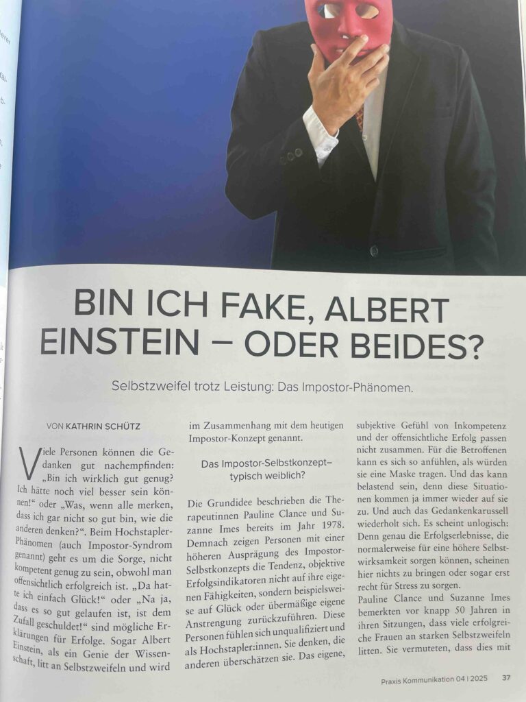 „Bin ich fake, Albert Einstein – oder beides?“ lautet mein Artikel in der PRAXIS KOMMUNIKATION. Wer top Leistungen zeigt, hat trotzdem manchmal Selbstzweifel und leidet unter dem Impostor-Phänomen. Den Artikel-Download gibt es hier: https://kathrin-schuetz.com/wp-content/uploads/sites/4/2025/10/425_Schuetz_Bin-ich-fake.pdf